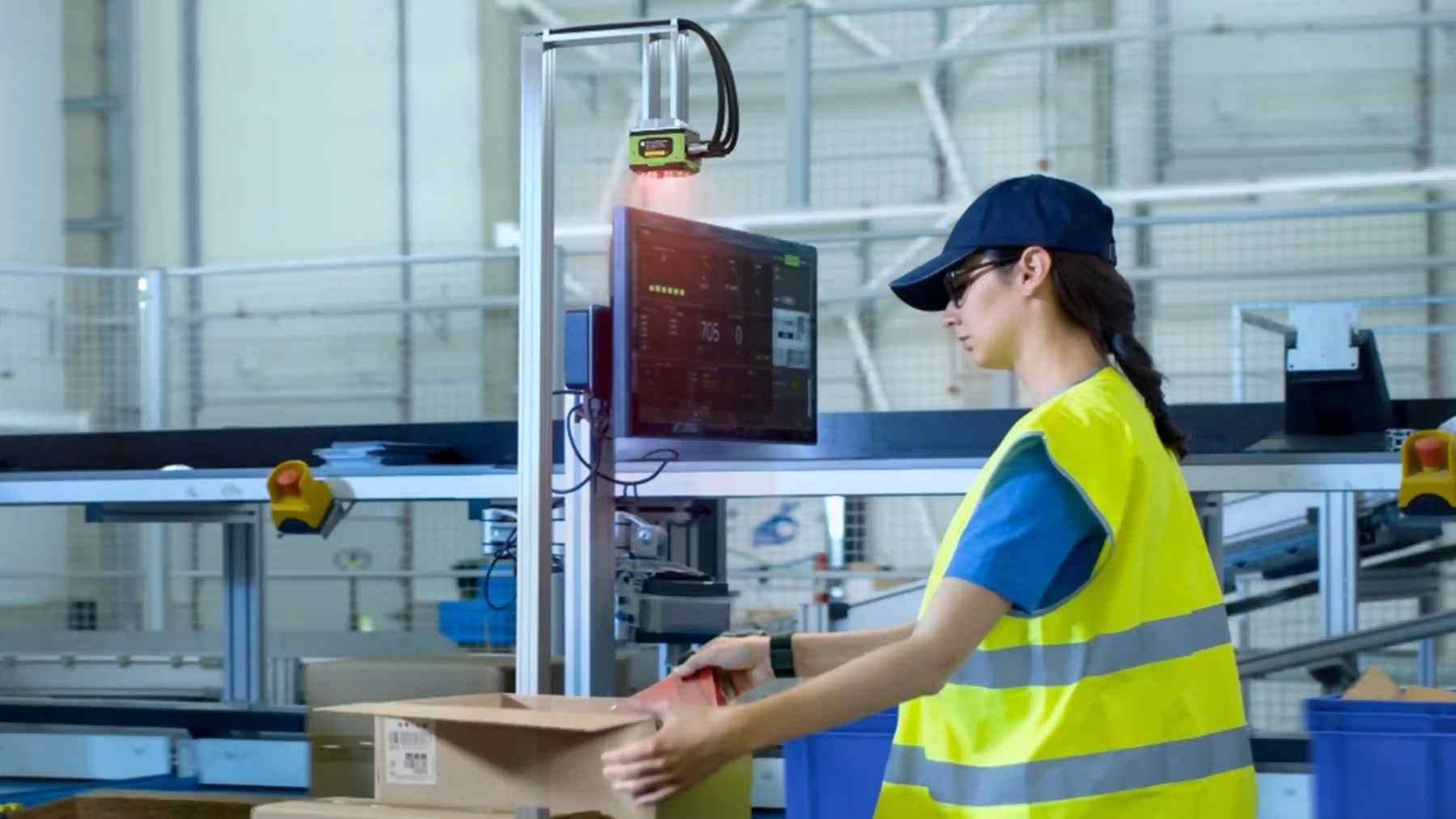 Un Scanner industriel fixe ZEBRA FS40 : installé au-dessus de la station d’emballage pour une capture de données rapide et précise.